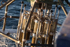 Now we have finally arrived at the second of the four main transects in the upwelling area. This one is located at about 25°S. Contrary to our expectations, the oxygen conditions here are even lower than on the more northerly transect at 23°S. In addition to significant decreases in dissolved oxygen towards the seafloor, we also observed a significant enrichment of the water with the toxic gas hydrogen sulfide. Hydrogen sulfide is produced in the course of bacterial degradation of organic material, preferably in sediment and under oxygen-free conditions, and is released by the bacterial cells into the surrounding environment. Many of us may remember muddy sediment smelling like rotten eggs at the bottom of a lake. This odor is typical of the toxic gas hydrogen sulfide (H2S).