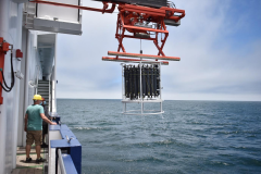 Yay, the time has come! We leave the harbour of Walvis Bay around 9:30 am and glide through the water towards the west, accompanied by sea birds and curious Cape lions. An extensive programme lies ahead of us, about which we would like to tell you more in the coming days. After a good three-hour journey, we finally reached our first station and the sampling programme began. For this, among other things, the CTD was lowered into the water with connected buckets so that we could take water samples at different depths. As the name suggests, the CTD measures conductivity, temperature and depth, as well as various other parameters. These values give a first impression of the water properties at different depths. With the water from the water samplers of this first CTD, we checked our instruments for their readiness for use. After overcoming some initial methodological hurdles, we headed to the station furthest from the coast on this first survey transect at 23° south latitude, and from there we headed back in a straight line towards the coast.