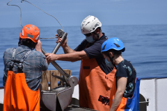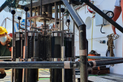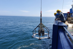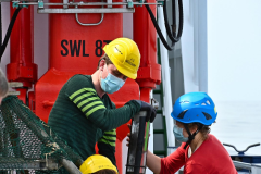 The macrozoobenthic-group, led by Dr. Michael L. Zettler, is interested, among other things, in the distribution of different marine species living in the sediment in the Benguela upwelling area. The group is also investigating how species living in the transition zone between the mud belt (muddy sediment belt along the coast) and the sandy seabed cope with the constantly fluctuating oxygen availability on the seabed and what metabolic measures they take to bridge periods of hostile conditions such as oxygen deficiency. To this end, PhD student Katherine Amorim is conducting experiments on board with freshly collected mussels.