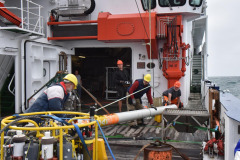 Various devices are used to get to the bottom of this. These include the so-called ScanFish and the microstructure probe (MSS for short). Both measuring devices are similar to the normal CTD, which we have already explained, and are equipped with sensors to determine temperature, salinity and oxygen, but differ in their resolution. While the sensors of the CTD and the ScanFish take 24 measurements per second, the MSS takes 1000 measurements per second. The ScanFish is a device that is attached to the stern, lowered into the water and then towed behind the ship. In the process, the ScanFish moves back and forth within the upper 140 m of water depth, alternating between the seabed and the surface. This provides a two-dimensional profile of oxygen, temperature, salinity and other parameters along a horizontal gradient. This knowledge is particularly helpful in selecting stations that are of greater interest and should therefore be sampled intensively. In our case, these are those with low to anoxic oxygen conditions. In addition to the sensors already mentioned, the MSS is also equipped with two shear sensors that can be used to measure turbulence in the water column, allowing profiles of water flow velocities and directions to be mapped down to a depth of 500 meters.
