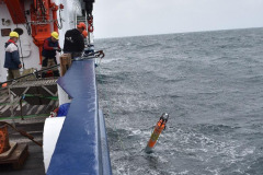 In addition, a drift body was launched at various points in the upwelling area during our trip and its transport path was tracked with the water current by GPS. This gives us further information about the flow paths of the different water masses. In addition, there is a rope attached to the drifter, to which temperature sensors are attached at defined intervals. When the drifter is lowered into the water, the measurements of the different temperature probes result in a vertical temperature profile that extends over a distance of 40 m, from which in turn information about the temporal dynamics in the stratification of the upper water body can be derived.
