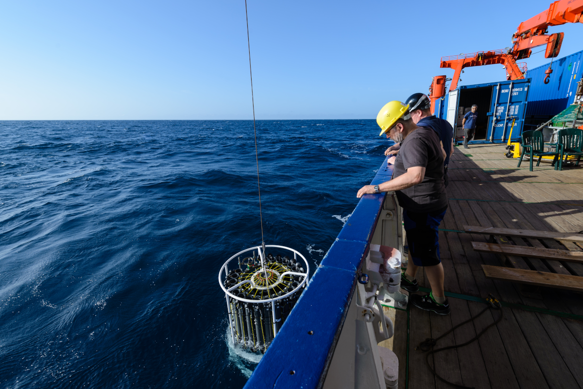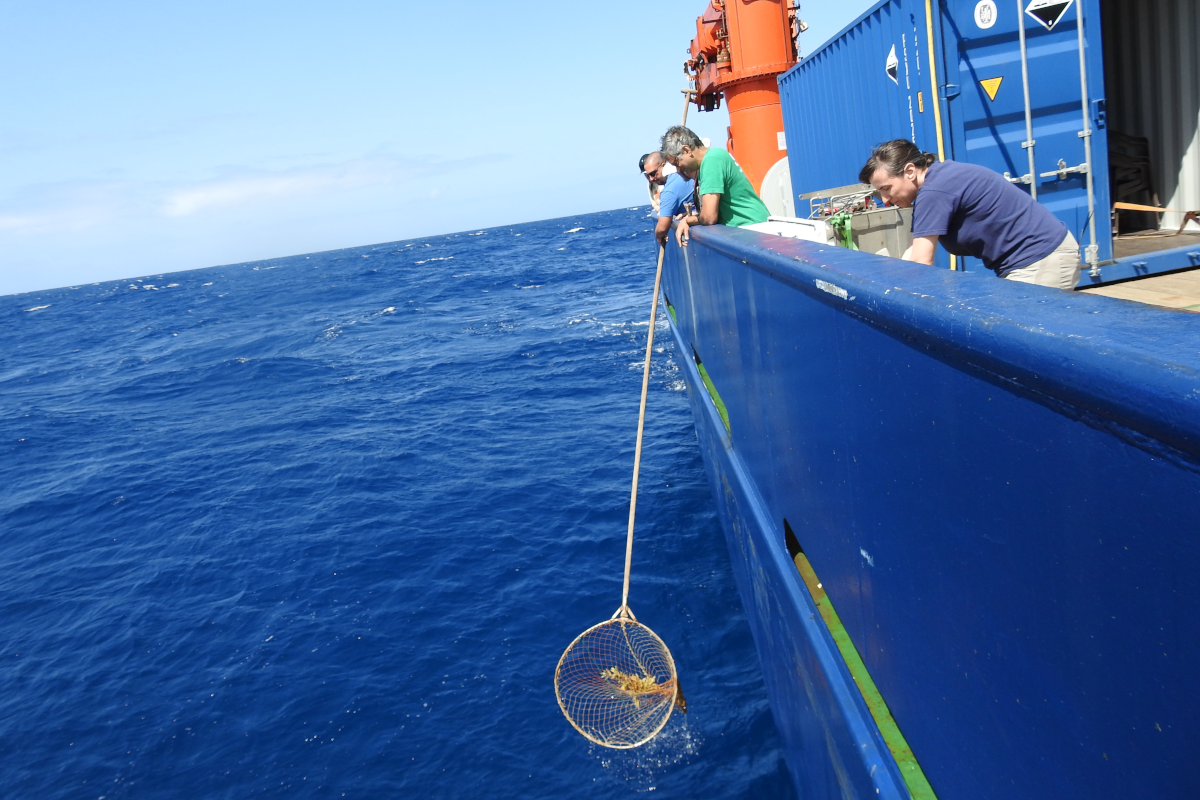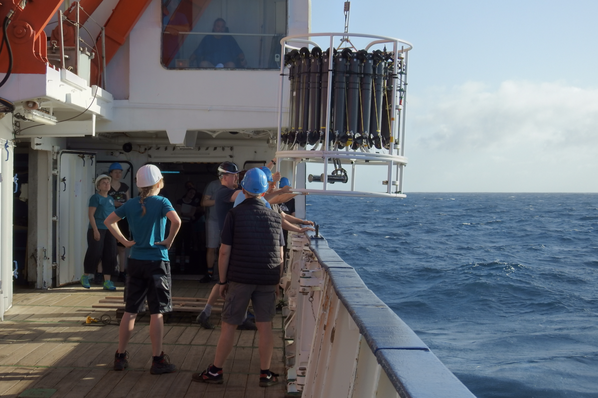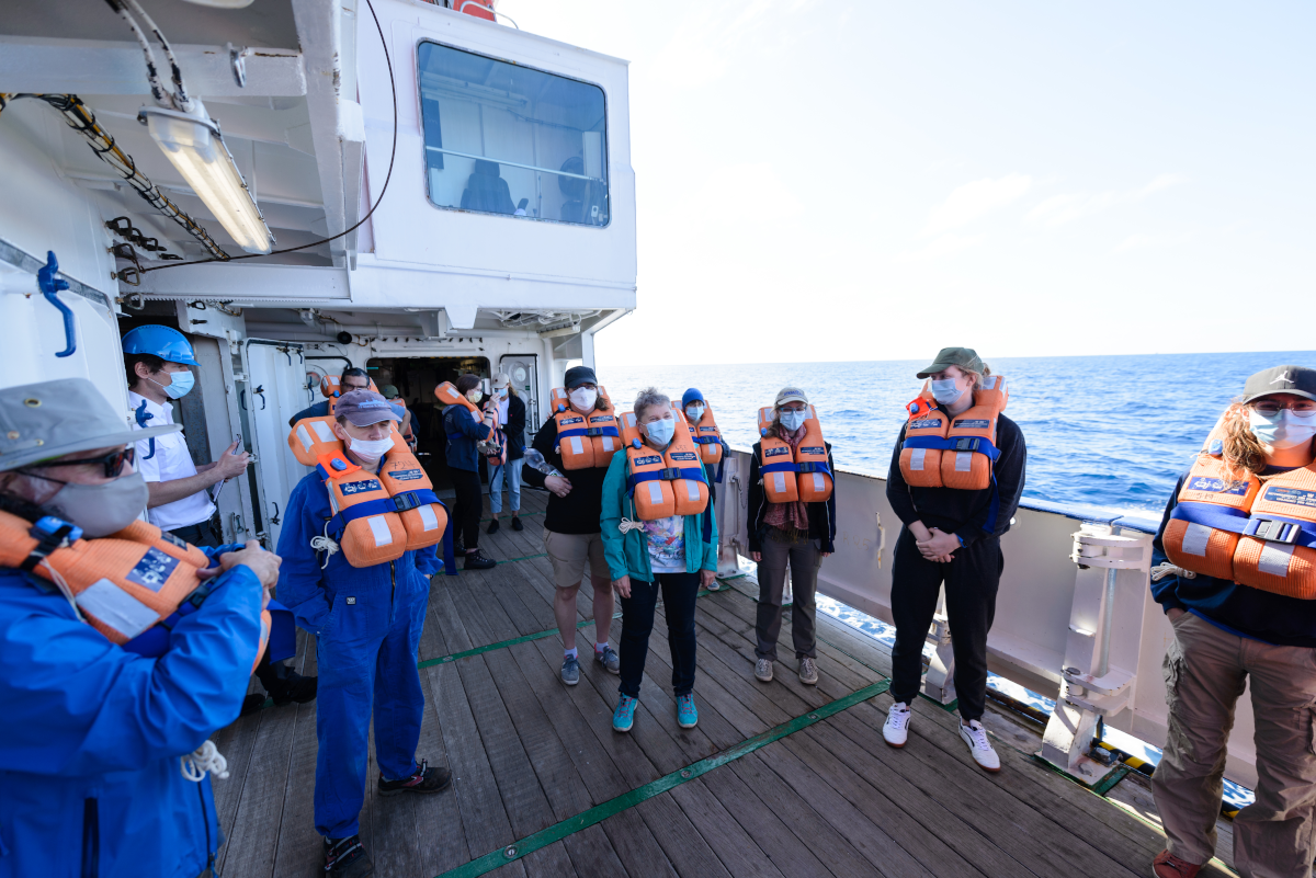 Our instruments are not the only one that need to be settled and safe! Once every lab was arranged, we had our safety instructions: with lectures and life vests on deck. Then life on board started and between the tests of our set ups and the first stations, we are getting to enjoy the sea and the excited jumps of flying fishes and dolphins fleeing from the bow of the Meteor.