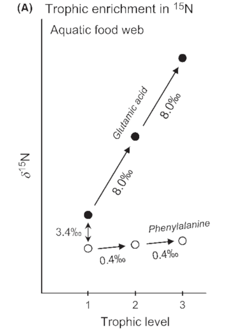 A simple comparison between the δ15N values of phenylalanine (Phe) and glutamic acid (Glu) from a single organism provides insight into its trophic level or trophic position (TP, Picture. 2). The δ15N of Phe remains nearly unchanged with each trophic transfer, reflecting the isotopic composition of the primary producers and its nitrogen source (N-source proxy). However, Glu is enriched in δ15N by ~8.0 ‰ every time it get transferred to a higher position in the food web. Comparing these two amino acids isotopic composition therefore eliminates potential sources of error associated with temporal and physiological changes in a consumer’s diet. It allows us to define its step less TP in the food web with a TP of 1.0 defining autotrophs, a TP of 2.0 defining herbivores, a TP of 3.0 defining carnivores, and a TP in-between, e.g. of 2.5 or 2.6, defining omnivores, or in case it is between 1.0 and 2.0 (e.g. TP of 1.5) it defines so called mixotrophs.