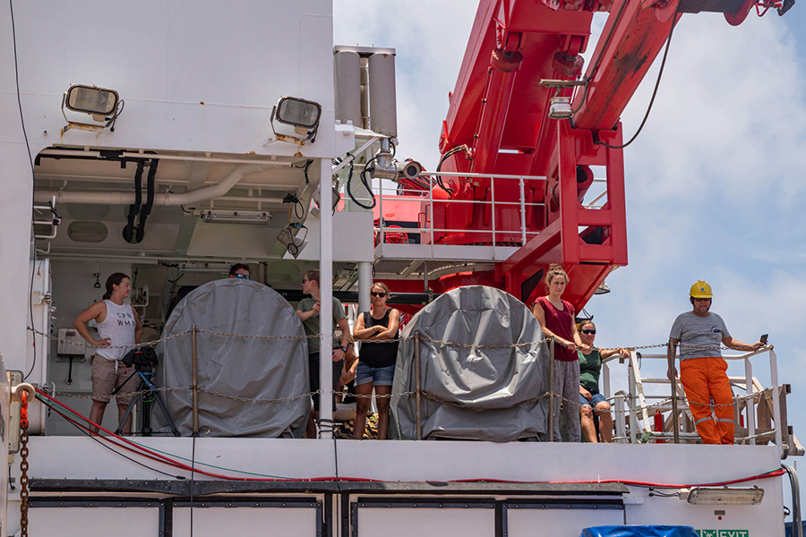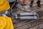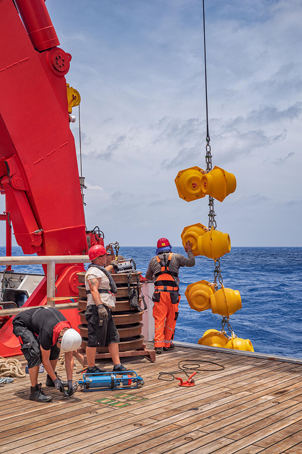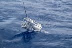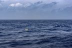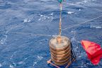 Another 550 metres of mooring line later, the acoustic releasers were lowered into the water. They are a crucial part of the mooring as they are needed to retrieve the measuring devices in two years’ time: After receiving an acoustic signal from the ship, they disconnect the line with the instruments from the bottom weight and allow it to float to the surface. To increase the chances of a successful release, we have installed two independent releasers. At 3:13 p.m., almost three hours after the top buoy, the bottom weight finally went in. It has a parachute so that it doesn’t plummet down too quickly. This is important, because this way, all components of the mooring are pulled into the depth evenly without tangling. And so we looked for the buoyancy packs and the top buoy with some tension to see if everything goes as planned. Reassuringly, the buoyancy packs disappeared from the water surface one after the other and after about ten minutes the top buoy also vanished from sight. It will float at a depth of about 150 to 200 metres below the surface, hopefully deep enough not to be caught by fishing activities.