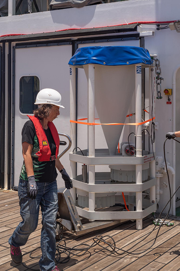 At first, the weather was not ideal: A strong breeze created waves with whitecaps. However, as our meteorologist on board had promised decreasing waves for later, the mooring work was scheduled to start after lunch. At 12:19, with the top buoy, the first piece of the mooring went to water. Next up was the optical nitrate sensor, a pack of buoyancy spheres and the first current meter with CTD. A lot of helping hands are needed to get all the components ready and to lay out the ropes, so that everything can be swiftly and smoothly put together. Such a well-choreographed activity always draws an interested audience, which today followed the activities from one deck up. About one hour and 850 meters of mooring line after the top buoy went in the sediment trap was launched. It will collect material sinking through the water column in its funnel in sample bottles. There are 40 bottles that are put below the funnel one after the other by a rotation mechanism. This will allow to identify temporal changes in quality and quantity of the sinking material over a longer period of time.