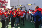 From time to time the work (and also the free watch) has to be interrupted for a safety exercise – an important precaution so that everyone knows at all times without hesitation what to do in an emergency. Everyone has to proceed to the muster station with long sleeves, shoes, a hat and – of course – a life vest. After work, you can sit on deck in one of the corners and enjoy the end of work together with colleagues or simply look out at the sea.