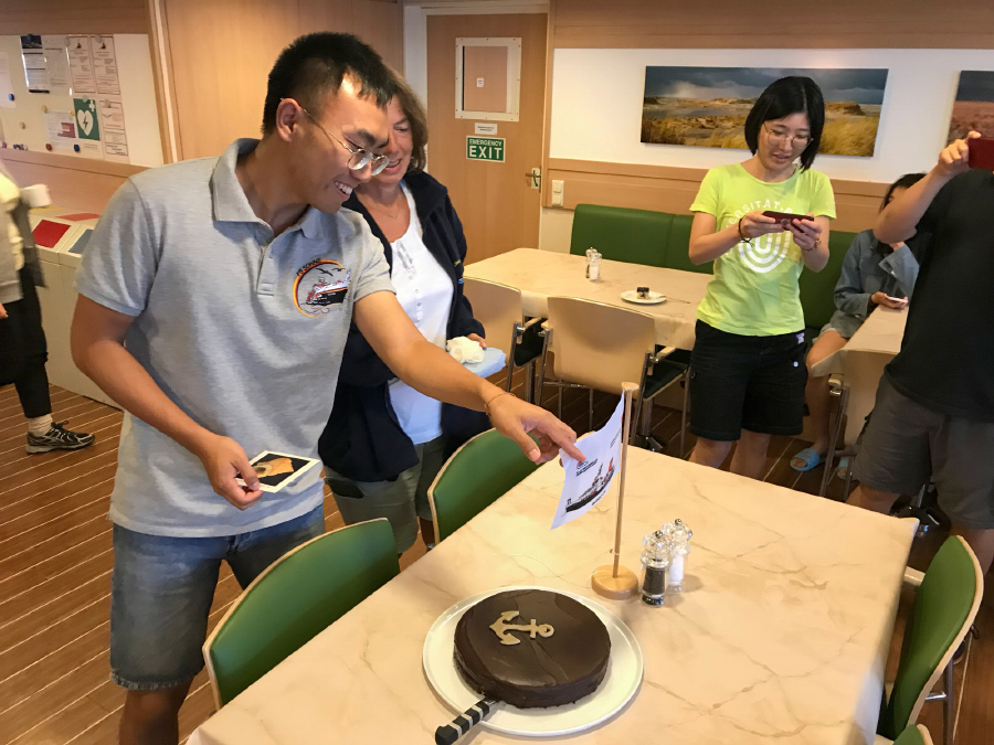 With 38 scientific cruise participants and a one-month trip, there is bound to be the odd birthday to celebrate on board. Shichao Tian was the first and he got some presents and a birthday cake, as did Jassin Petersen and Jana Appelt who also had their birthday on board this year.