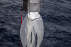 Today we would like to take a look at the plankton sampling. Two instruments are in use for that during our cruise: The plankton net and the multi closing net. Plankton nets are made of fine but tough fabric (our plankton net has a mesh size of 0.5 mm, the multi closing net has a mesh size of 100 µm). They are funnel shaped and are hoisted up through the water column so that the sample is collected in a beaker at the small end of the net. The beaker walls are also made from fabric (or at least some part of it) so that the water can get out of it again.