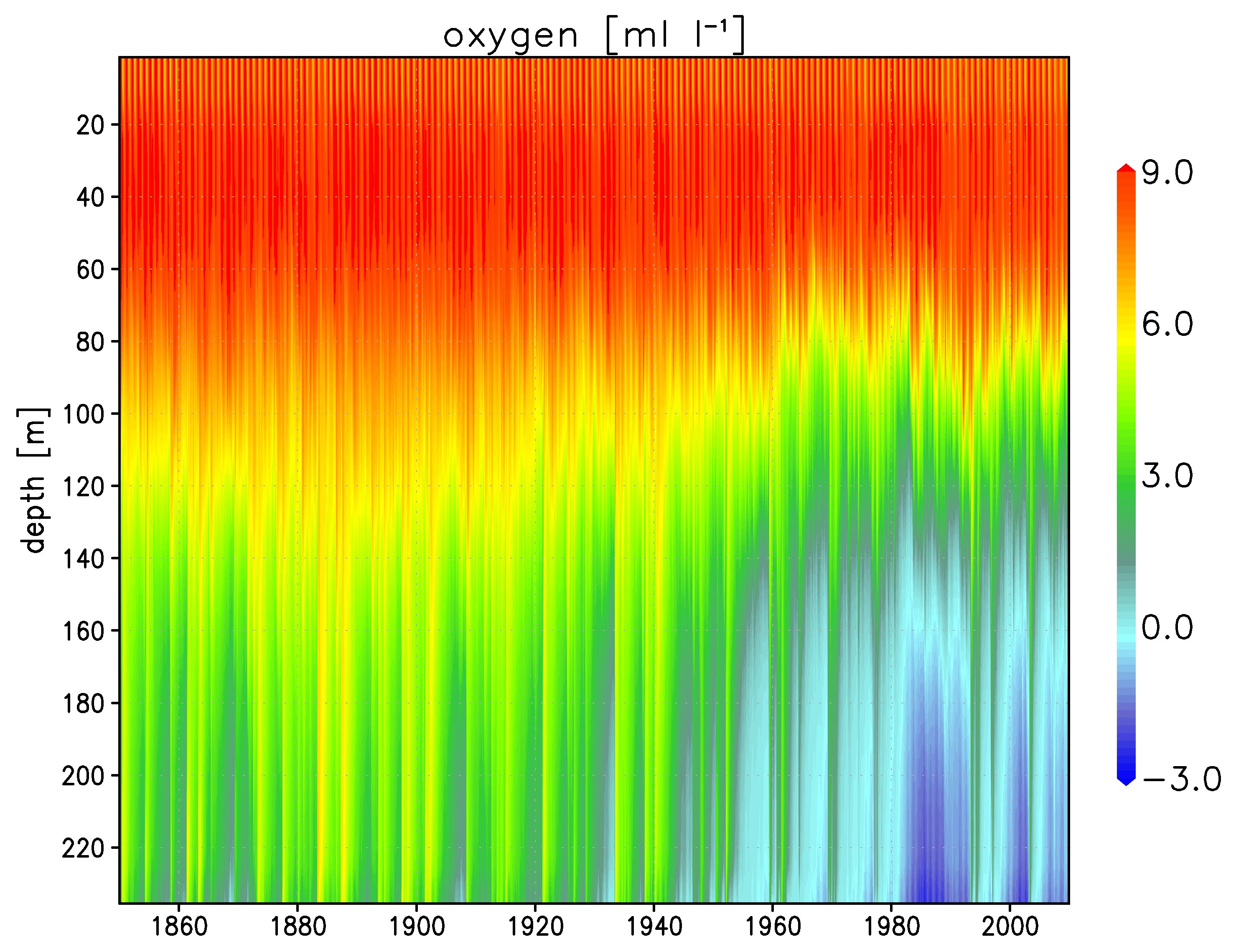 Einiges lässt sich jedoch schon mit bloßem Auge erkennen. So zeigen Sedimentkerne, die nicht älter als 8.000 Jahre sind, an vielen Stellen dunkle, fein übereinander geschichtete Lagen, die immer wieder von hellen, homogenen Sedimentpaketen unterbrochen werden. Dieser regelmäßige Wechsel macht deutlich, dass schon in der Vergangenheit immer wieder Sauerstoffmangel im Mare Balticum herrschte. Die feine, von keinem wühlenden Wurm, keiner Muschel zerstörte Schichtung ist ein untrügliches Zeichen für O2-Mangel am Meeresboden. Die homogenen Sedimentpakete sind dagegen von bodenlebenden Tieren „gut durchmischt“ und zeigen sauerstoffreiche Bedingungen an.