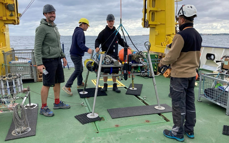 The shallow coastal zone is very difficult to sample due to ist limited depth. For this reason, the IOW first spent several years developing new methods and equipment for this purpose. The Elisabeth Mann Borgese has very well-equipped laboratories and served as a working platform during the expedition. Divers launched their diving operations from another small boat, during which they carefully sampled seagrass beds and took undisturbed sediment and water samples. The samples were then immediately analyzed and processed on board the research vessel. In addition, so-called landers and other state-of-the-art measuring systems were used to measure climate-relevant trace gases, nutrients, and turnover processes on the seabed from on board. A lander is a platform that combines several autonomous measuring and sampling devices and is placed on the seabed for 24 to 48 hours. The scientist Allison Schaap from the National Oceanography Centre (Southampton, UK) joined the IOW research team to perform highly accurate measurements of nutrient concentrations using autonomous nutrient analyzers.