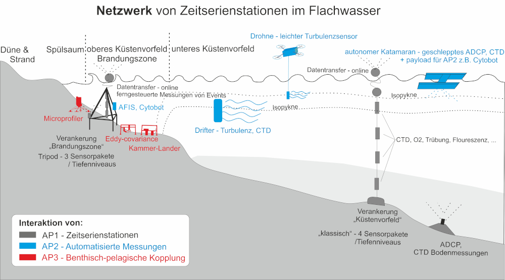 In den anspruchsvollen Umweltbedingungen der Brandungszone ist der Einsatz von Messgeräten für alle geplanten Themenbereiche erforderlich. Arbeitspaket 1 entwickelt die technische Implementierung und stellt sich der Herausforderung technische Geräte auf langen Zeitskalen in dieser hochdynamischen Zone zu betreiben.