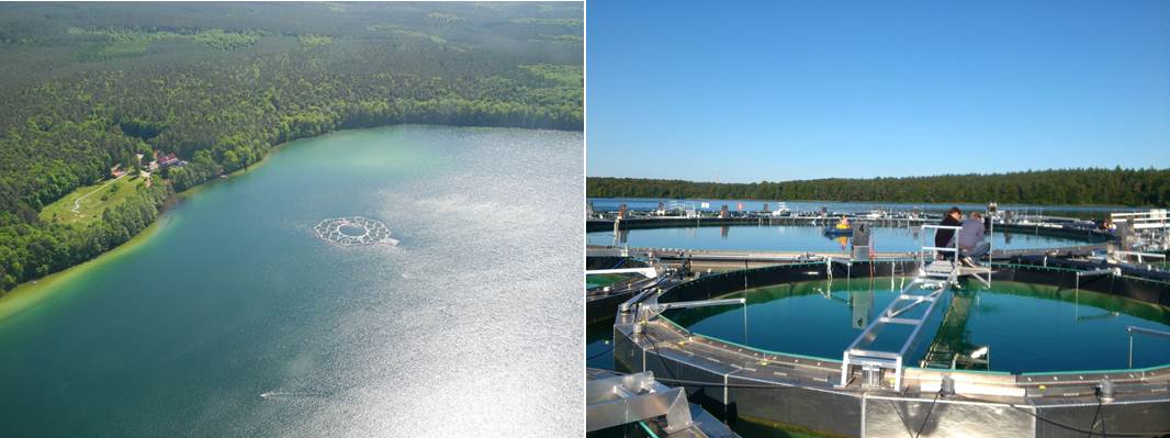 Figure 1: Experimental mesocosms in Lake Stechlin. Left: View of the mesocosm facilities from above (Foto: P.Casper); Right: Sampling of the mesocosms (Foto: IGB)