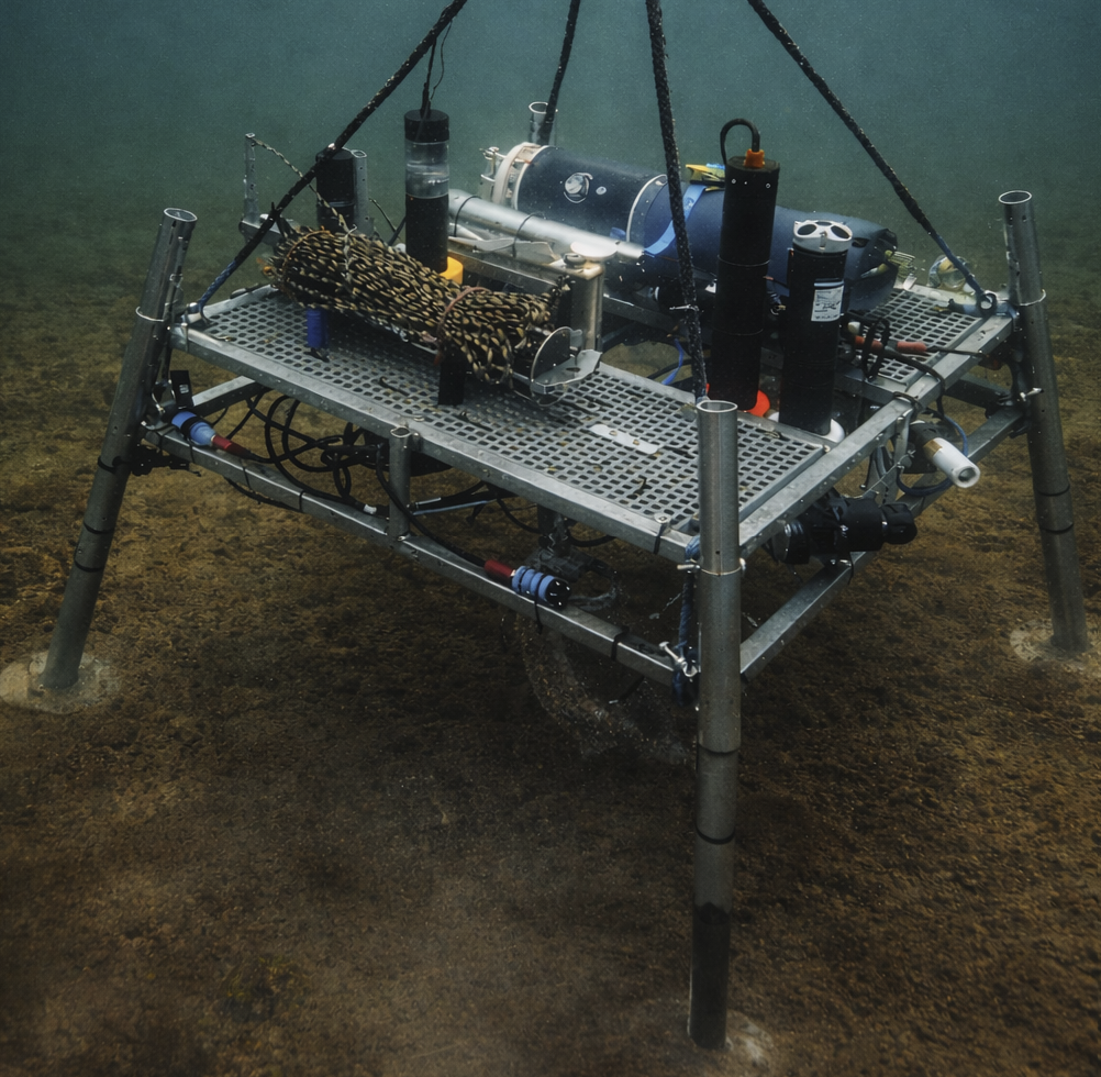 | Reallabor Nienhagen: Die Verankerungen sind permanent installiert und ermöglichen eine kontinuierliche Erfassung physikalischer und biogeochemischer Parameter. Ergänzend dazu werden die Lander gezielt für ereignisbasierte Einsätze eingesetzt, beispielsweise während hypoxischer Wellen, um kurzzeitige, dynamische Prozesse mit hoher zeitlicher Auflösung zu erfassen. |