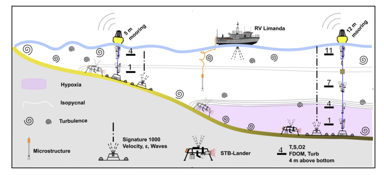 Wir haben Nienhagen als repräsentatives Untersuchungsgebiet für unsere Projekte ausgewählt. Als sogenanntes Reallabor lassen sich dort mithilfe unserer Verankerungen kontinuierlich hochaufgelöste biogeochemische und physikalische Daten erfassen. Hierzu betreiben wir Verankerungen in 12 m und 5 m Wassertiefe, die mit verschiedenen Messinstrumenten ausgestattet sind, darunter CTD-Systeme, mit denen Leitfähigkeit, Temperatur sowie Sauerstoff, Chlorophyll und gelöster Kohlenstoff bestimmt werden können. Diese Infrastruktur ermöglicht es insbesondere, kurzzeitige und dynamische Ereignisse wie hypoxische Phasen, Temperaturspitzen oder turbulenzgetriebene Austauschprozesse in hoher zeitlicher Auflösung zu detektieren und in ihrem natürlichen Kontext zu analysieren.
