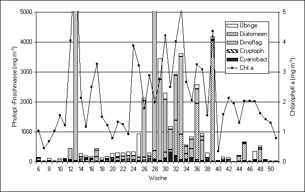 Nach sehr geringen Phytoplanktonbiomassen im Mai kam es im Juni zu einem Anstieg insbesondere durch Wachstum von Kieselalgen (Diatomeen), insbesondere Dactyliosolen fragilissimus. Die Kontinuität der Datenreihe wird kurzzeitig unterbrochen durch Starkwindereignisse am 7.7. (27. Woche) und 25.8.98 (34. Woche), die an der flachen Untersuchungsstation zu Sedimentaufwirbelungen führen, welche die mikroskopischen Algenzählungen verfälschen. Der Höhepunkt der Blüte von Dactyliosolen fragilissimus wurde am 14.7.98 (28. Woche) mit einer berechneten Frischmasse von 2,68 g m-3 registriert (Phytoplankton-Biomasse insgesamt 6,5 g m-3). Die Chlorophyllgehalte der Kieselalgen sind allgemein gering im Vergleich zur "Frischmasse", in die die große Vakuole mit eingeht, welche kein Chlorophyll enthält. Nennenswerte Biomassen blütenbildender Cyanobakterien (Nodularia spumigena, Aphanizomenon "baltica", Anabaena sp.) traten nur Anfang August (31. Woche) auf. Im August entwickelten sich zunehmend Dinoflagellaten (z.B. am 11.8.98: Ceratium tripos = 931 mg m-3; am 17.8.98: Prorocentrum minimum = 802 mg m-3; am 8.9.98: Ceratium tripos = 1690 mg m-3). Bei den Kieselalgen ging die Vorherrschaft von Dactyliosolen fragilissimus ab 8.9.98 verloren: am 8.9. waren Guinardia flaccida und Proboscia alata die wichtigsten Kieselalgen und am 15.9.98 Coscinodiscus granii.