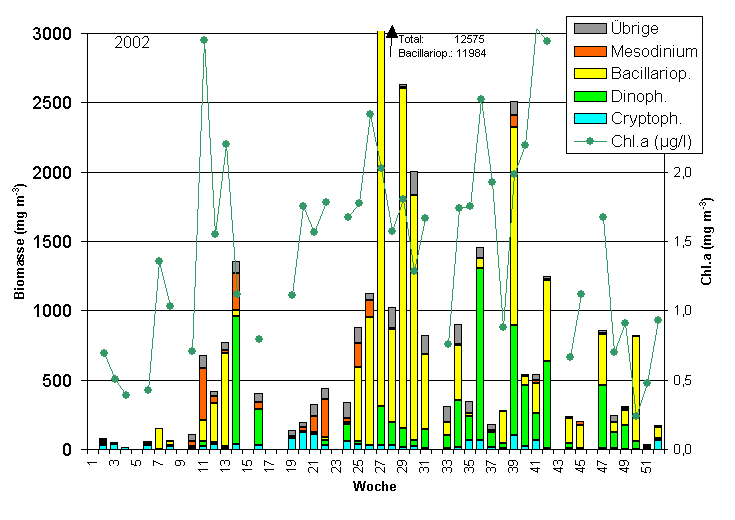 The post-bloom phase was dominated by cryptophyceae (Teleaulax sp., Hemiselmis sp.). After a short pulse of Mesodinium rubrum (week 22) and Heterocapsa rotundata (week 24), the typical summer bloom of the large diatom species Dactyliosolen fragilissimus starts. The maximum of this species was reached on 10.7.2002 (27. week) with a wet weight of 11801 mg m-3. The high biomass is not reflected in the chlorophyll concentration because the biomass of the large diatoms is mainly based on a large vacuole that does not contain chlorophyll. On 30.7., also Cerataulina pelagica was important (394 mg m-3). A cyanobacteria bloom did not occur.