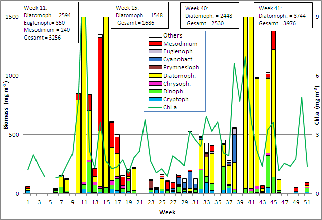 Surprising was the spontaneous appearance of the euglenophyte Eutreptiella sp. (350 mg m-3) , which was also found in 2008. At the same time, chlorophyll a concentrations reached the annual maximum (12.25 mg m-3 ). That means: We found in 2010, just like in 2009, a very early spring bloom which contained 80% diatom biomass, and it was rather diverse.