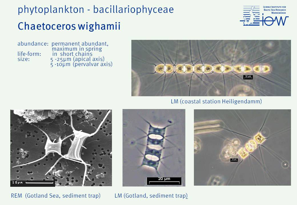In contrast to the year 2009, not only Skeletonema costatum but several diatom species constituted the main components of the bloom, which occurred since week 10. The spring bloom consisted at its peak (16.3.2010, week 11) mainly of Rhizosolenia setigera (801 mg m-3), Skeletonema costatum (787 mg m-3), Chaetoceros wighamii (617 mg m-3) and Thalassiosira spp. (253 mg m-3).