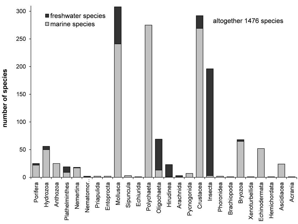 Die Ostsee, vom marinen Milieu im Kattegat bis hin zu den ausgesüten Bereichen der Bottnischen Wiek und einschließlich der zahlreichen inneren Küstengewässer, verfügt über ein Arteninventar des Makrozoobenthos von ca. 1500 Arten. Wie in der Abb. 1 dargestellt, zählen Vertreter von 26 Gruppen (Klassen, Ordnungen etc.) dazu. Die artenreichsten Gruppen sind die Mollusca, Crustacea und Polychaeta. In ausgesüßteren Bereichen der Ostsee kommen zahlreiche Süßwasserarten vor, was sich insbesondere bei den Insekten, Mollusken und Krebsen bemerkbar macht.