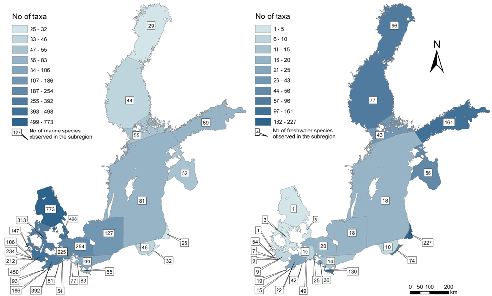 Der starke Gradient im Salzgehalt vom marinen Kattegat bis hin zur limnischen Bottnischen Wiek spiegelt sich selbstverständlich in der Besiedlung durch Makrozoobenthos wider. Einzelne Subregionen der Ostsee sind unterschiedlich artenreich (Abb. 2). Die marinen Arten schwinden mit zunehmnder Aussüßung Richtung Norden. Auf der anderen Seite nimmt die Anzahl der Arten zu, die im Süßwasserarten ihren Ursprung haben. Ähnlich verhält es sich mit den inneren Küstengewässern (Bodden, Haffe, Fjorde, Buchten), die in der Regel zwischen eigentlicher Ostsee und einmündenden Flüssen liegen. So ist die Artenzahl beispielsweise im Kurischen oder Frischen Haff relativ hoch, was auf die dort vorkommenden Süßwasserarten zurückzuführen ist.
