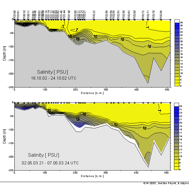 Triggered by these exceptional observations made at the measuring platforms, an ad-hoc expedition with the research vessel „Professor Albrecht Penck“ was performed from 24th until 26th by IOW in order to trace the actual spatial and temporal distribution of the water masses. The area under investigation covered the Baltic Sea between the Mecklenburg Bight and the Bornholm Basin. Focus was laid on hydrographical measurements accompanied by numerous oxygen determinations. The inflowing water had reached the Arkona Basin where it formed a 10 m thick saline layer at the bottom along a section through the centre of the basin. This water was well enriched with oxygen (around 8 ml/l).