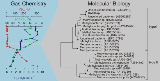 Water column samples taken in summer 2008 from the stratified Gotland Deep (central Baltic Sea) showed a strong gradient in dissolved methane concentrations from high values in the saline deep water (max. 504 nM) to low concentrations in the less dense, brackish surface water (about 4 nM). The steep methane-gradient (between 115 and 135 m water depth) within the redox-zone, that separates the anoxic deep part from the oxygenated surface water (oxygen concentration 0 ‑ 0.8 ml L-1), implies a methane consumption rate of 0.28 nM d‑1. The process of microbial methane oxidation within this zone was evident by a shift of the stable carbon isotope ratio of methane between the bottom water (d13C CH4 = -82.4‰) and the redox-zone (d13C CH4 = ‑38.7‰). Water column samples between 80 and 119 m were studied to identify the microorganisms responsible for the methane turnover in that depth interval. Notably, methane monoxygenase gene expression analyses for water depths covering the whole redox-zone demonstrated that accordant methanotrophic activity was probably due to only one phylotype of the aerobic type I methanotrophic bacteria. An imprint of these organisms on the particular organic matter was revealed by distinctive lipid biomarkers showing bacteriohopanepolyols and lipid fatty acids characteristic for aerobic type I methanotrophs (e.g., 35-aminobacteriohopane-30,31,32,33,34-pentol), corroborating their role in aerobic methane oxidation in the redox-zone of the central Baltic Sea.