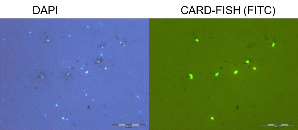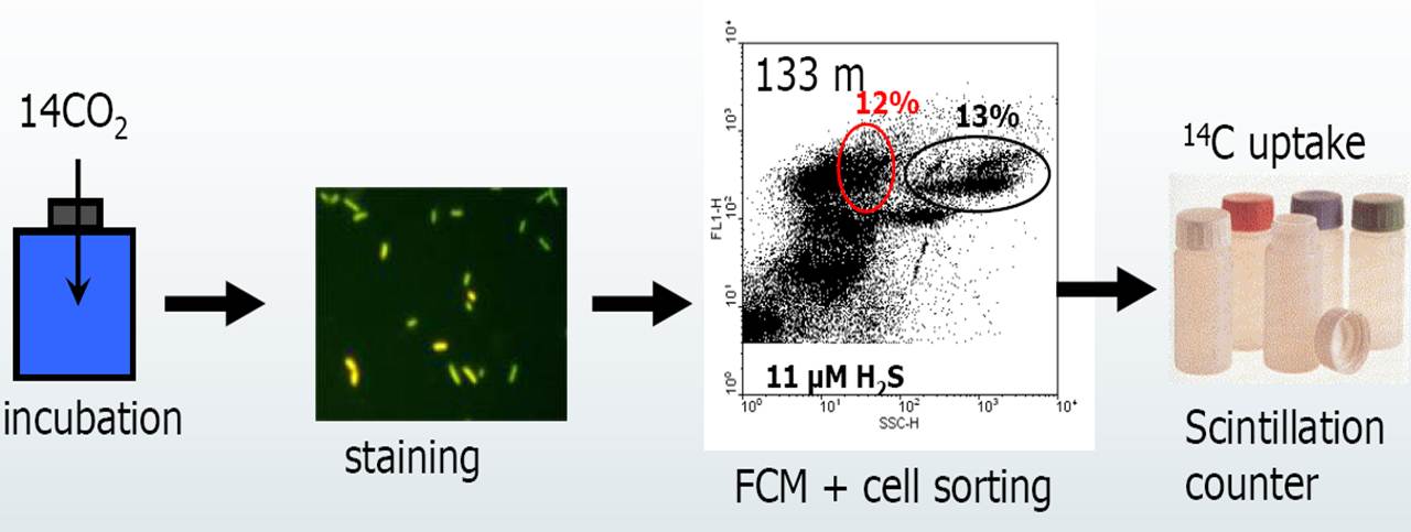 In order to identify the major chemoautotrophic prokaryotes and also to prove that Epsilonproteobacteria are involved in CO2 fixation in the redoxcline, we combined [14C] bicarbonate incorporation studies with CARD-FISH analysis and microautoradiography (MARFISH). In absolute numbers, maximal 3 x 105 14CO2 fixing prokaryotic cells mL-1 were detected for a central Baltic Sea and 9 x 104 14CO2 fixing cells mL-1 for a Black Sea redoxcline. These numbers corresponded to 29 % and 12 % of total prokaryotic cell abundance, respectively. 14CO2 incorporating cells belonged exclusively to the phylum Bacteria. Among these, approximately 70 % in the central Baltic and nearly 100 % in the Black Sea (Fig. 5) were members of the Epsilonproteobacteria. Moreover, for the Baltic Sea the particular Sulfurimonas subgroup GD17 could be identified as the absolutely dominating chemoautotrophic organism.
