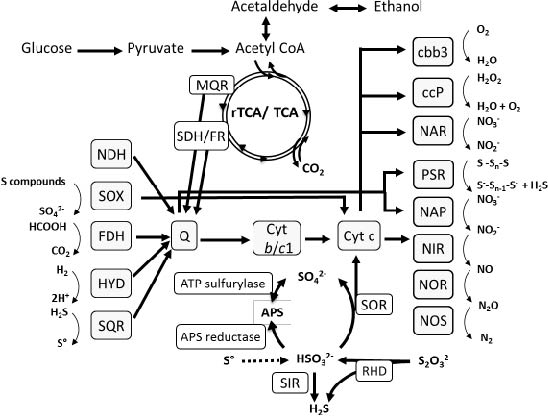 In vitro experiments and genome analysis revealed that ´Sulfurimonas gotlandica´ str. GD1 has a considerable metabolic versatility, capable of both chemoautotrophy (fueled by different electron donor and acceptor combinations) and utilization of organic substrates. Experiments confirmed the consumption of nitrate and hydrogen sulfide or thiosulfate and production of sulfate, suggesting that chemolithoautotrophic denitrification is an important respiratory pathway in this organism. ´Sulfurimonas gotlandica´ str. GD1 showed a pronounced ability to exploit a wide range of reduced sulfur compounds as electron donors, including elemental sulfur, sulfite, and hydrogen sulfide. Genome analysis revealed that the ´Sulfurimonas gotlandica´ str. GD1 chromosome contains a complete set of genes required for chemolithoautotrophy and encodes the components of the reductive citric acid cycle (rTCA) for inorganic carbon fixation, all reductases necessary to reduce nitrate to nitrogen gas, including NAP and NAR, and different enzyme systems for the oxidation of reduced sulfur compounds (Fig. 8). In addition to the sulfur reducing Sox multienzyme complex, several enzymes known to oxidize sulfite to sulfate via the intermediate adenosine-5´-phosphosulfate in a Sox-independent pathway were also encoded in the genome.