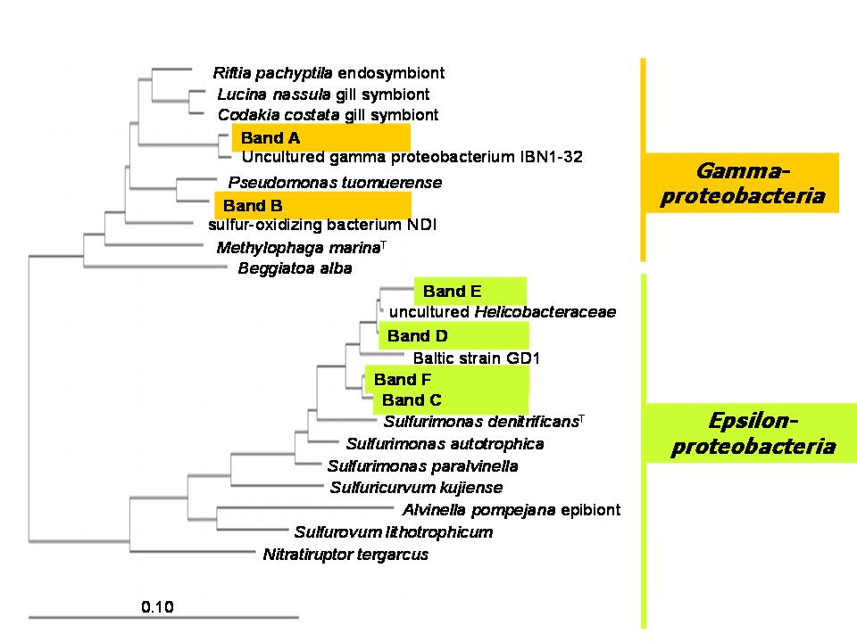 Figure 6. Unrooted phylogenetic tree of bacterial 16S rRNA sequences showing the affiliation of the identified bacterial SSCP bands, enriched in 13C, and their closest relatives within the Epsilon- and Gamma-proteobacteria. The tree was reconstructed using the neighbor-joining method based on com-parison of approximately 400 nucleotides. Only bootstrap values above 70% are shown. Bar, 10 substitutions per 100 nucleotides. Modified from Glaubitz et al. (2009).