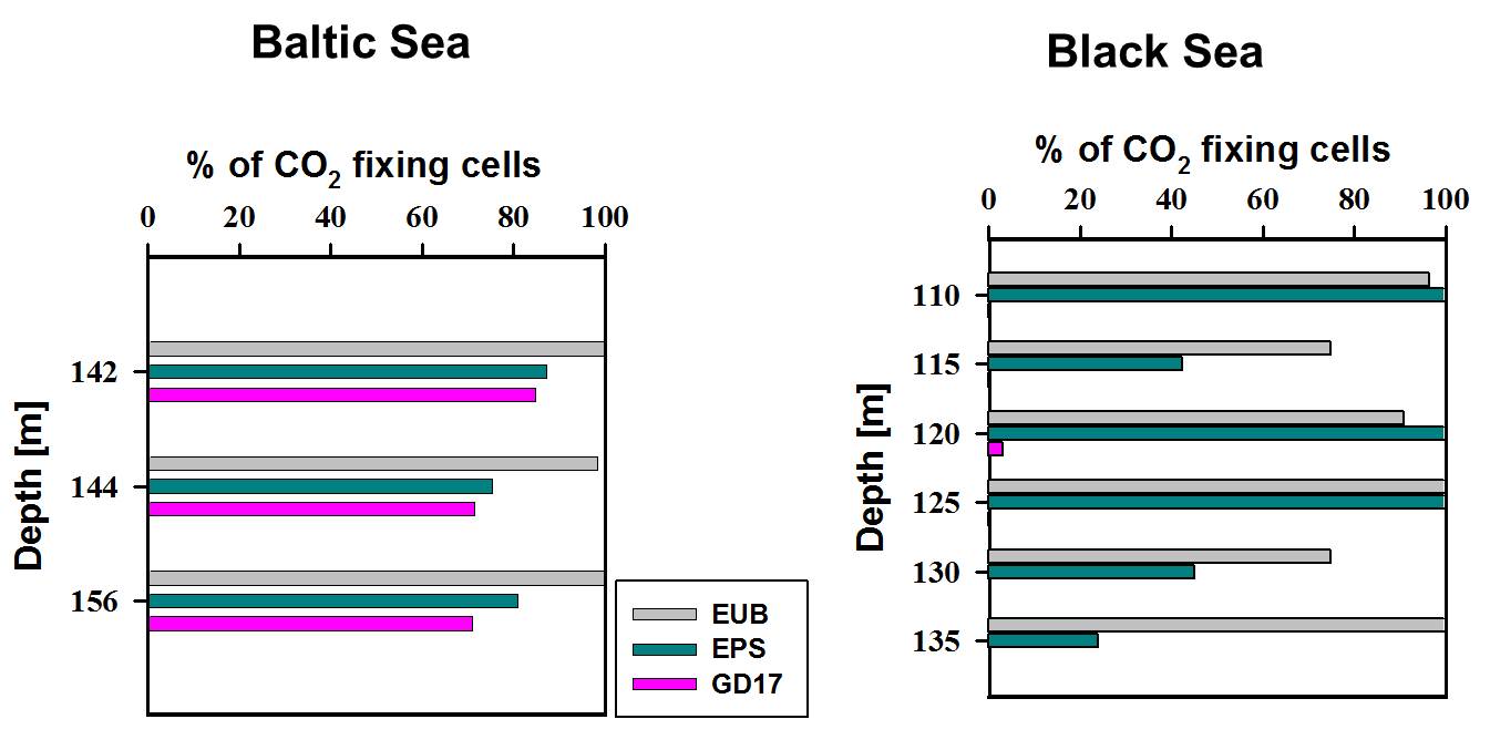 Figure 5. Relative proportion of 14CO2-assimilating prokaryotes belonging to Eubacteria (EUB), Epsilonproteobacteria (EPS), and group GD17, as determined by MARFISH for redoxcline samples from the Baltic and the Black Sea. Modified from Grote et al. (2008.)