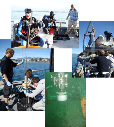 Successful field work in Santa Barbara (California, USA) together with colleagues from the IOW, UCSB and GEOMAR. Samples were taken at the “Rostocker-Seep” (Coal Oil Point seep field) in about 10 m water depth. The pictures show the “Bubble Catcher” used to collect the gas bubble at the sediment/water interface.