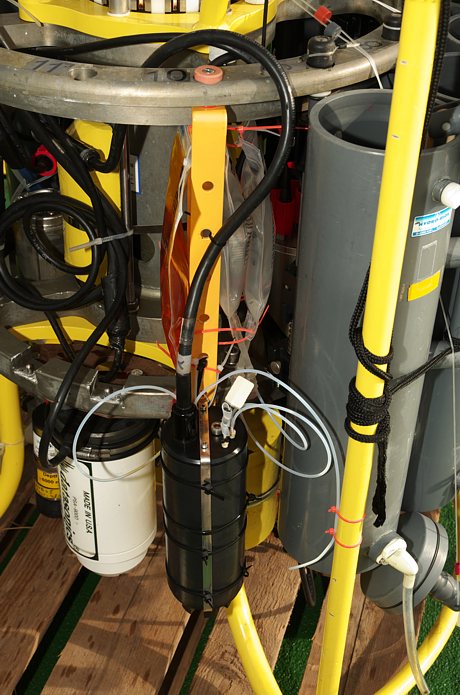 to a blank solution and a known standard. Thus, ‘onboard’ 2-point calibrations (standard and blank) can be carried out during deployment. This has the advantage that a correction for any effect that pressure and/or temperature may have on the colorimetric system can be applied to the data.