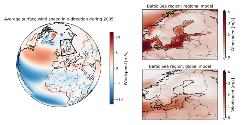 Mean zonal wind speed over the Baltic Sea in a GCM (MPI-ESM) and an RCM (RCA4-NEMO). The global perspective (left) shows the average surface zonal wind speed in MPI-ESM (CMIP5) in 2005.