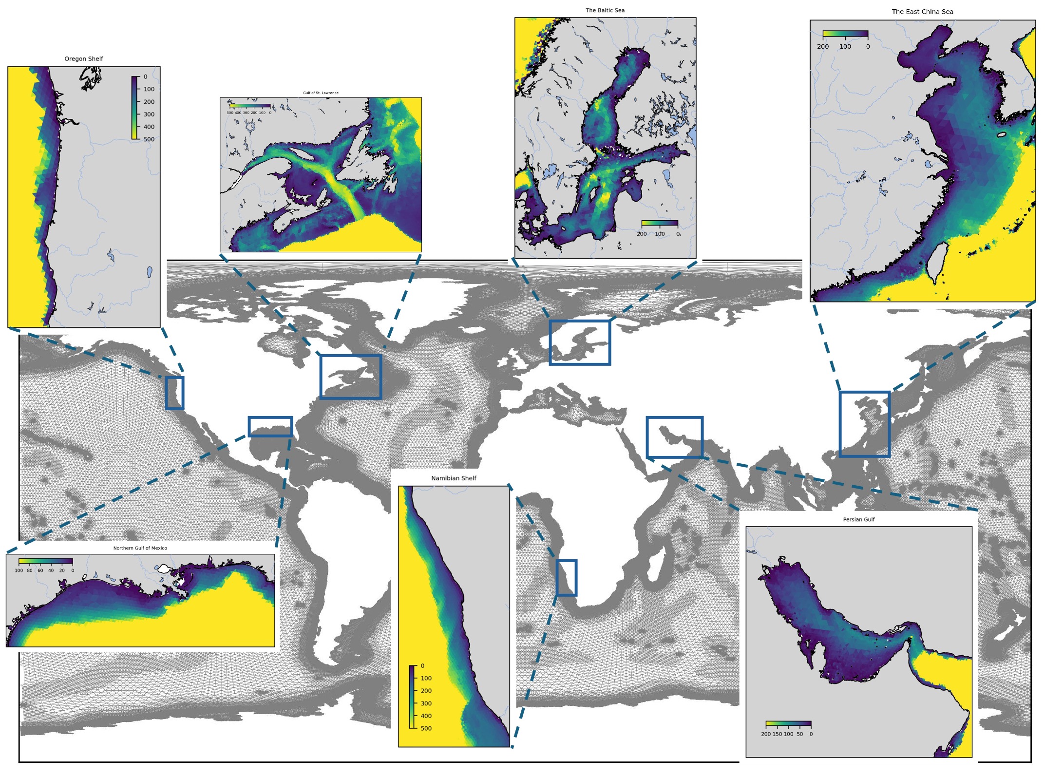 Figure 1: ICON-Coast grid (underlying figure) and examples of the coastal systems worldwide experiencing hypoxia. The bathymetry was taken from GEBCO (https://www.gebco.net) and interpolated to the native ICON-Coast grid. The Figure is adapted from Fennel and Testa (2019).