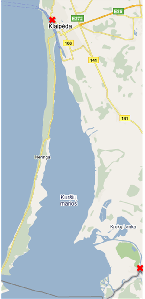 Klaipeda: 55,69°N, 21,13°E; Nemunas: 55,30°N, 21,38 E