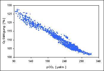 In der unteren Abbildung ist die Sauerstoffsättigung gegen den pCO2 für den Schnitt am 23.4. aufgetragen. Entsprechend den biochemischen Vorgängen bei der Photosynthese ist der CO2-Verbraucht mit der Freisetzung von O2 verbunden. Eine O2-Übersättigung von nahezu 30% wird während der intensiven Biomasse-Produktion im Nordosten beobachtet. Da CO2 und O2 ein unterschiedliches Verhalten beim Gasaustausch mit der Atmosphäre zeigen, wird sich der Zusammenhang zwischen der O2-Sättigung und dem pCO2 mit der Zeit ändern. Hieraus lassen sich Transfergeschwindigkeiten für den Gasaustausch berechnen.