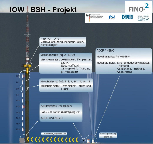 The hydrographic measurement systems are coordinated by the BSH on all three platforms. IOW, partner of the BSH for more than 20 years, has been responsible for the installation and long term operation of the system on FINO2 since 2012. Due to this IOW designed a fitted equipment concept for Kriegers Flak, which meets the standards of strong layers, a high vertical and time variability. The realization consists of a continuous monitoring of the key data at the wind measurement platform including remote data transmission to the FINO-Database. The system was completly developed and transferred into a nonstop operation mode. So far received long term series fulfill the requirements of the construction and raiser consortium and commercial enterprises to full extent and support the offshore wind energy research.