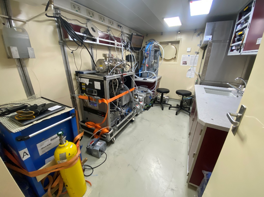 Die Arbeitsgruppe Marandino vom GEOMAR Institut für Ozeanforschung Kiel führt für die Bestimmung von k Eddy-Kovarianz Messungen durch. Diese Technik erfordert eine schnelle und präzise Messung des vertikalen Windes und der gleichzeitigen (ebenso schnellen und präzisen) Messung der Gaskonzentrationen, welche zur Bestimmung des Gasflusses mathematisch kovariiert werden. An Bord des Forschungsschiffes werden mit diesen Techniken die Gase CO2 und DMS untersucht. Windgestützte Messungen werden an einem eigenen Mast durchgeführt, welcher am Bug des Schiffes aufgestellt wurde und mit Inlets für CO2 und DMS ausgerüstet ist (Abb. 2). Die analytischen Instrumente sind durch Schläuche und Kabel mit dem Mast verbunden, so dass die analytische Auswertung in einem Labor unter Deck stattfindet (Abb. 3). Die Trennung der Messorte (Mast und Labor) und die Bewegung des Schiffes stellen uns vor schwierige Herausforderungen. Zusätzlich zu diesen Herausforderungen kommen noch ungünstige Windbedingungen (Windrichtung), gegeben durch die Verfolgung des Tracerpatches. Deshalb ist es vor allem bei den täglichen CTD Stationen von Vorteil, wenn das Schiff mit dem Mast in den Wind gerichtet ist. Für den Rest der Fahrt hoffen wir jedenfalls auf gute Winde.