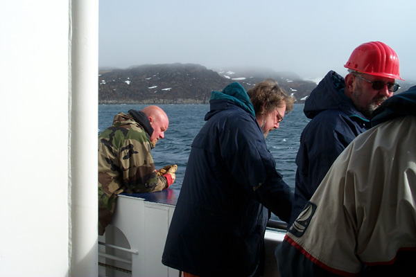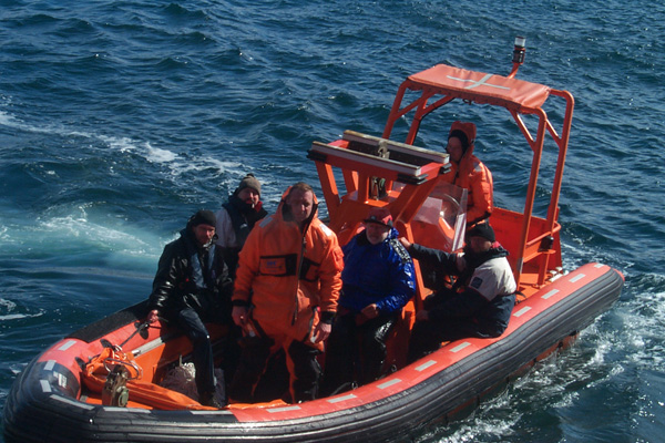 Der Arbeitstag beginnt mit dem Aussetzen des Rettungsbootes. Bootsmann Norbert Kreft (Mitte) und die Matrosen Hardy Schwieger (links) und Bernhard Pruchnow (rechts) haben Prof. Dietrich und seine Begleiter beim Besteigen des Bootes im Blick.