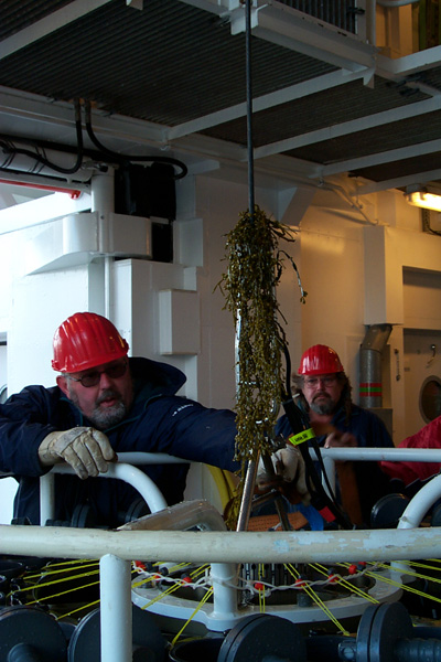 Die CTD-Sonde wird immer als erstes Gerät ins Wasser gelassen. Der Einsatz wird jedoch abgebrochen, weil starke Strömungen die Sonde mit sich ziehen. Es besteht die Gefahr, dass sie unter das Schiff gerät. Beim Hieven hat Neptun ihr noch eine Girlande um die Kette gelegt.