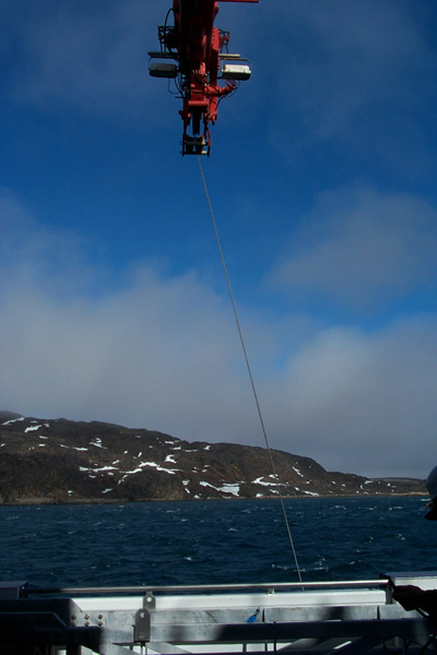 Auch der Boxcorer hat mit der Strömung zu kämpfen. Der Draht zeigt an, dass der Kastengreifer sich vom Ausgangspunkt entfernt hat.
