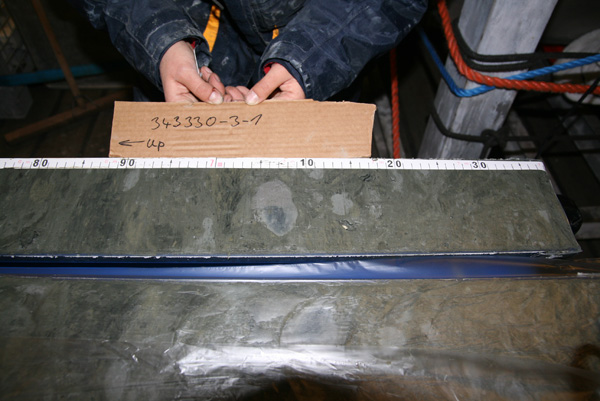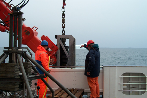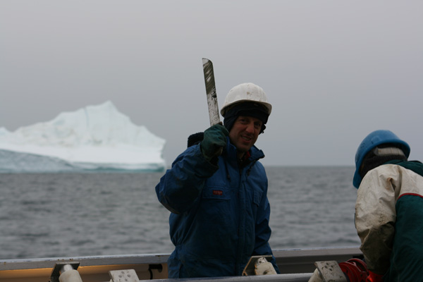 Die Sedimentkerne, die hier in der Disko Bay genommen werden, zeigen deutlich so genannte drop stones - Gerölle aus weichem Sediment, die nur in gefrorenem Zustand in dieser Form auf den Meeresboden gelangt sein können. Sie sind Indikatoren für driftende Eisberge, die diese drop stones beim Abschmelzen fallen lassen.