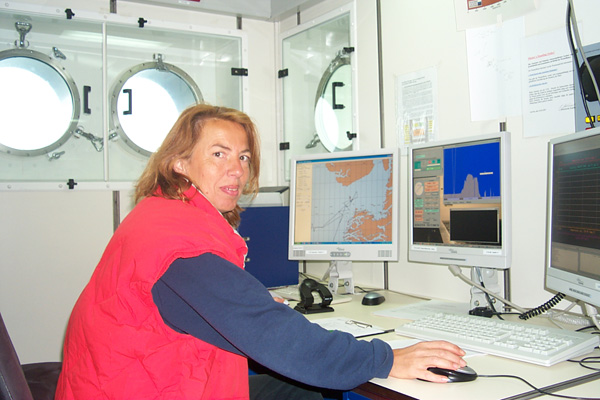 Im CTD-Labor kommen die Messwerte der Sonde an, während sie in die Tiefe gelassen wird. So kann man unterschiedliche Wasserkörper erkennen. Hier - am Eingang zur Disko Bay lässt sich auf diese Weise in der Tiefe der relativ warme und salzhaltige Westgrönland-Strom erkennen. Joanna Waniek, die als einzige Ozeanographin an der Fahrt teilnimmt, verfolgt auf den Monitoren die Entwicklung der Werte und entscheidet auf dieser Basis, in welcher Tiefe die Wasserschöpfer sich automatisch schließen sollen.