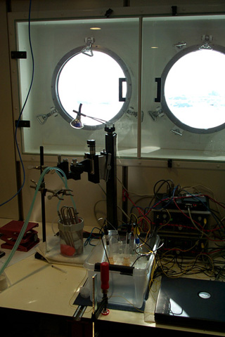 Im Chemielabor haben Nils Risgaard-Petersen und Sören Rysgaard vom Institut für natürliche Ressourcen in Nuuk ihre Messreihen aufgebaut. Sie messen mit empfindlichen Sensoren den Sauerstoffgehalt im Sediment. Sie untersuchen, wie Mikroorganismen das Sediment verändern (P0001917).