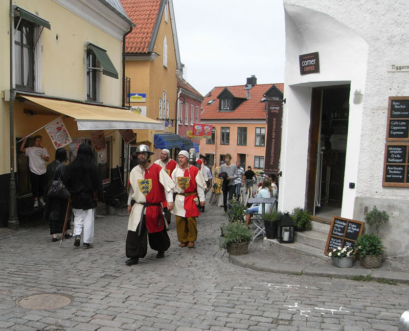 Vorerst aber können wir für wenige Stunden festen Boden unter den Füßen spüren. Erfreulicherweise finden wir die Stadt Visby, die mit seiner komplett erhaltenen Stadtmauer ohnehin wie aus vergangener Zeit stammend erscheint, auch noch am ersten Tag des Mittelalter-Festivals vor, was für die Landgänger eine willkommene Abwechslung zu unserer augenblicklichen HighTech-Umgebung darstellt. So ist die Stadt fest in der Hand von Rittern und anderen Mittelalterlichen Gestalten, teilweise bewaffnet mit Helm und Schild, Bögen, Äxten und Langschwertern.