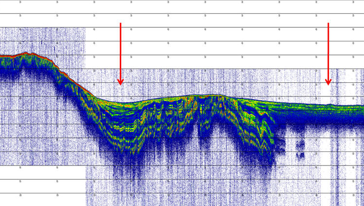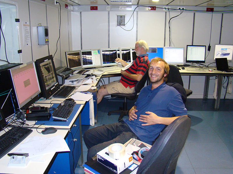 Darauf aufbauend haben wir dann hier an Bord eine Vielzahl akustischer Methoden in Gebieten eingesetzt, in denen große Mengen organischen Materials abgelagert sind, also eben die abgestorbenen Biomasse, aus der Methan durch Mikroorganismen gebildet werden kann. Allen akustischen Methoden hier ist gemeinsam, dass man Schallwellen in Richtung Meeresboden schickt und aus dem zurückgeworfenen Signal Informationen über die Beschaffenheit der Meeresbodenoberfläche oder bis viele Meter in den Meeresboden hinein erhält. Das einfachste System dieser Art, das wohl auch die meisten kennen, ist ein einfaches Echolot, das eigentlich jedes Schiff hat die Wassertiefe anzeigt. Für uns ist dieses nicht wissenschaftliche Gerät eher störend. Je nach Art und Frequenzbreite der eingesetzten akustischen Systeme gibt es ganz unterschiedliche Informationen zu gewinnen.