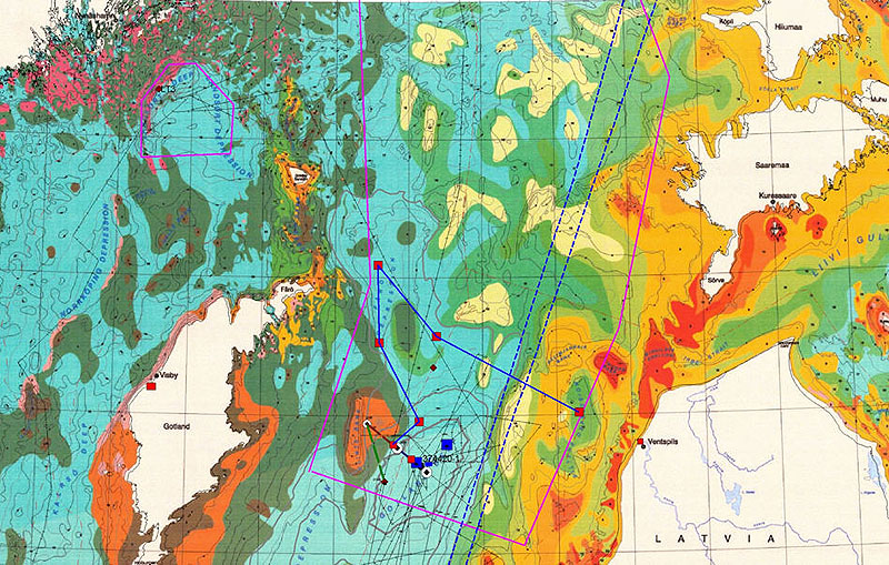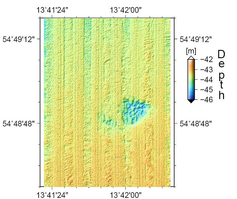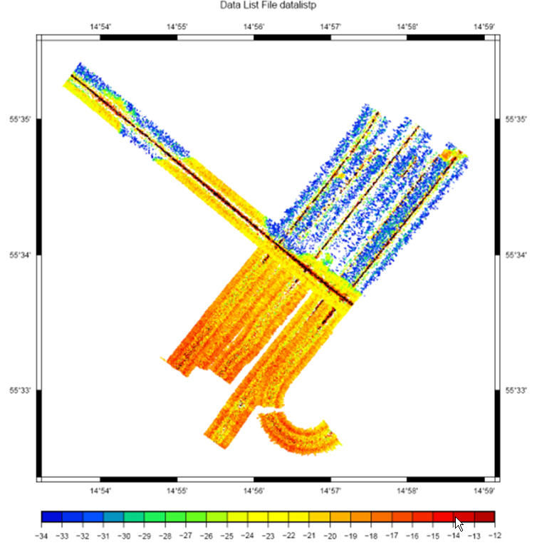 Das Tiefwasserfächerecholot wird normalerweise in den Wassertiefen der Ostsee gar nicht verwendet, doch zeigt sich, dass man es, ganz wie die Einstrahl-Instrumente, dazu verwenden kann, einige Meter in den Meeresboden hineinzusehen, und damit zweidimensional die flachen Gasvorkommen zu kartieren.