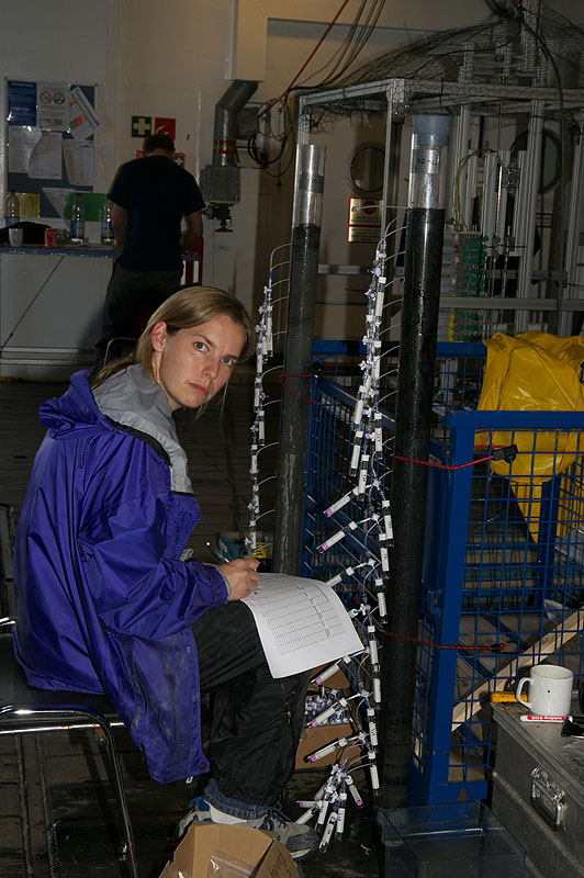 Die Kerne werden dann in den Laboren aufgearbeitet, etwa um den Methangehalt der Sedimente zu bestimmen oder die Konzentrationen von Sulfid und Sulfat, die an der Umsetzung des Gases beteiligt sind. Die Beprobung zur Gewinnung des Porenwassers sieht recht klinisch aus muss teilweise bei Temperaturen von unter 2°C im Kühlraum erfolgen. Das Geochemielabor ist wegen der vielen gewonnenen Sedimente im Dauerbetrieb. An einigen der Proben werden auch die Methanbildungs- und Zehrungsraten gemessen. Dazu werden die für die Reaktionen jeweils notwendigen Ausgangsstoffe zugegeben, und zwar in Form radioaktiv markierter Substanzen. Nach einiger Zeit kann dann gemessen werden, wie viel radioaktives Methan gebildet oder aber radioaktives Sulfat verbraucht wurde. Aus dem letzeren kann man dann direkt die Methanzehrungsraten ermitteln. Diese Arbeiten erfolgen im eigens hierfür installierten Isotopencontainer, einem der am wenigsten besuchten „Labore“ des Schiffes. Die langen Sedimentkerne werden in 1m lange Stücke gesägt und halbiert. Dann erfolgt eine komplette Kernbeschreibung, ein hochauflösende Fotographie der Oberfläche und schließlich einige Instrumente, die mm-genau etwa die magnetischen Eigenschaften, die Scherfestigkeit, oder die Leitfähigkeit durch die Sedimente hindurch erfassen können (Kernlogger).