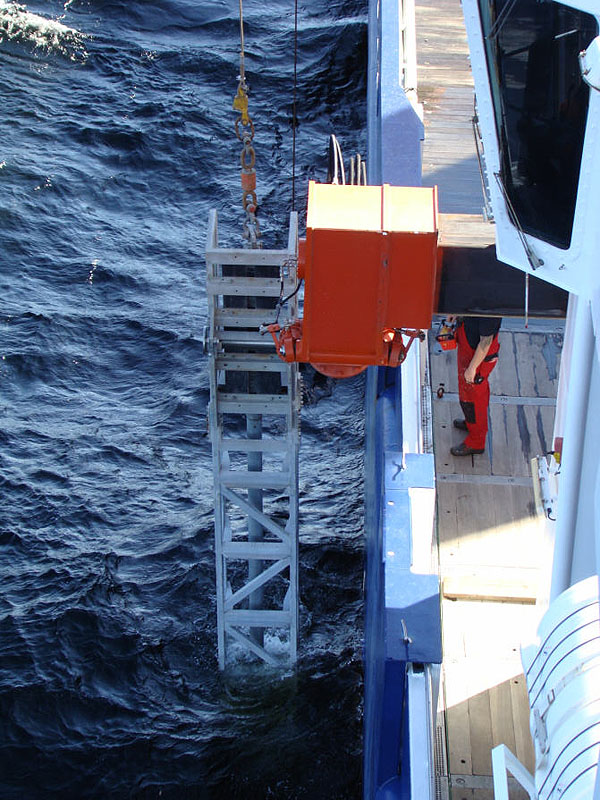Mit all diesen akustischen Information suchen wir uns dann geeignete Stellen für das Gewinnen von Sedimentkernen. Dabei braucht man für unterschiedliche Fragestellungen unterschiedliches Gerät. Rumohrlote und Frahmlote für die Gewinnung von Kernen von bis zu 1,5m Länge, an denen man die an der Oberfläche ablaufenden Prozesse gut untersuchen kann, etwa den Fluss von Methan aus dem Sediment oder den Verbrauch von Sauerstoff. Will man längere Sedimentkerne gewinnen, so greift man auf das Schwerelot zurück. Hier auf Maria S. Merian, das mit einem Kernabsatzgestell ausgestattet ist, kann man Kerne von bis zu 18 m Länge gewinnen, und in der Tat haben wir mit 16 m Länge auf dieser Fahrt den längsten Sedimentkern „gezogen“, der je am IOW gewonnen wurde.