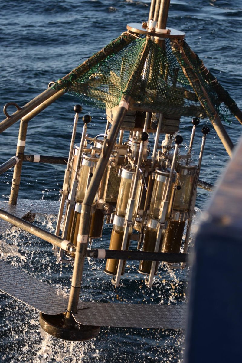 Nun sind wir endlich auf dem zweiten der vier Haupt-Transekte im Auftriebsgebiet angelangt. Dieser liegt bei ungefähr 25°S. Entgegen unserer Erwartungen sind die Sauerstoffbedingungen hier noch geringer als auf dem nördlich gelegeneren Transekt bei 23°S. Neben deutlichen Abnahmen des im Wasser gelösten Sauerstoffs in Richtung Meeresboden, konnten wir außerdem eine deutliche Anreicherung des Wassers mit dem toxischen Gas Schwefelwasserstoff feststellen. Schwefelwasserstoff wird im Zuge bakterieller Abbauprozesse von organischem Material, vorzugsweise im Sediment und unter sauerstofffreien Bedingungen, produziert und von den bakteriellen Zellen ins Umgebungswasser abgegeben. Viele von uns erinnern sich vielleicht an schlammiges nach fauligen Eiern riechendes Sediment am Boden eines Sees. Dieser Geruch ist typisch für das Vorkommen des giftiges Gases Schwefelwasserstoff, H2S. Noch eine äußerst interessante nicht-marine Nebeninformation: Schwefelwasserstoff wird mitunter auch in unseren Mägen in Folge von Gärungsprozessen produziert und zeigt sich durch übelriechenden Flatus oder, neben anderen flüchtigen schwefelhaltigen Verbindungen, als Mundgeruch.